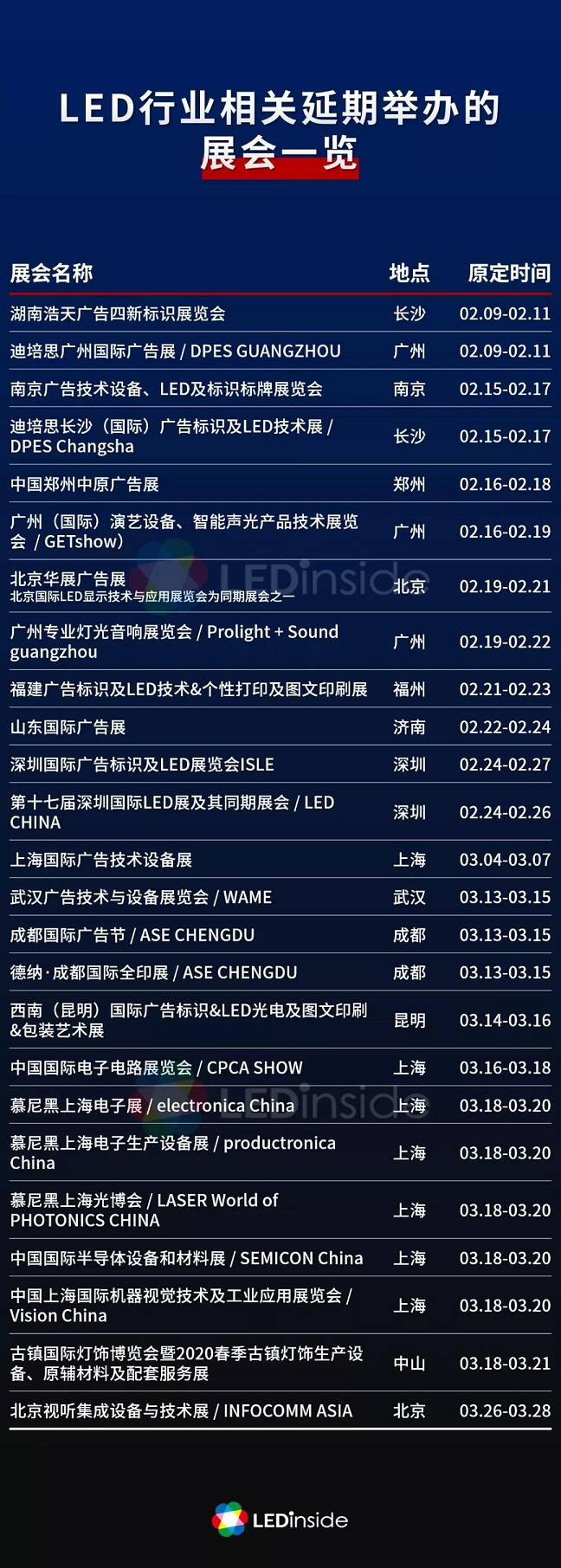 根據(jù)專業(yè)展會(huì)信息服務(wù)平臺(tái)展加消息顯示,截至2月12日,全國(guó)已有196場(chǎng)展會(huì)宣布延期舉辦,還有6場(chǎng)展會(huì)宣布取消舉辦。據(jù)LEDinside不完全統(tǒng)計(jì),其中與LED及照明行業(yè)相關(guān)的展會(huì)有24場(chǎng)。此外,日前中國(guó)·古鎮(zhèn)國(guó)際燈飾博覽會(huì)籌委會(huì)也宣布古鎮(zhèn)國(guó)際燈飾博覽會(huì)延期舉辦。這些展會(huì)的原定舉辦日期主要集中在2月和3月,具體舉辦時(shí)間將根據(jù)此次疫情控制情況而定,開展時(shí)間另行通知。